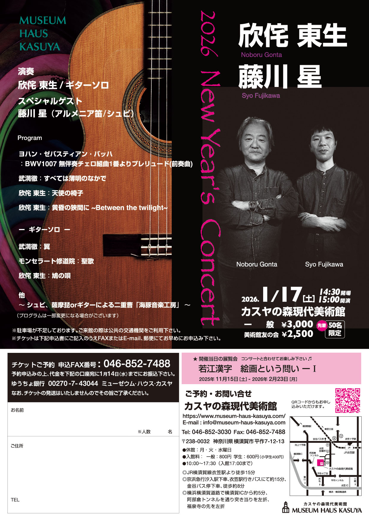 2025_12_20 2026年1月17日[土] ギタリストの欣侘東生さんのコンサートをカスヤの森現代美術館で開催いたします。欣侘さんのオリジナル曲やクラッシックなど、アルメリア笛奏者の藤川星さんとの共演も楽しみです。